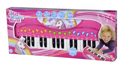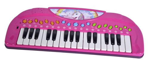 Elektronické piáno v růžové barvě s motivem jednorožce pro malé hudebníky, 32 kláves, 4 rytmy, demo a různé zvukové moduly. Velikost 42 cm.