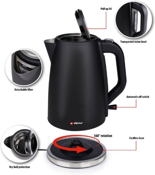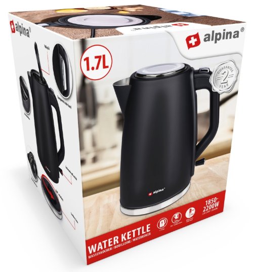 Konvice Alpina má objem minimálně 1,7 litru. To znamená, že pomocí jedné konvice uvaříte velké množství vody ve velmi krátkém čase. Díky průhlednému ukazateli hladiny vody přesně vidíte, kolik vody je v konvici a změříte si potřebné množství.