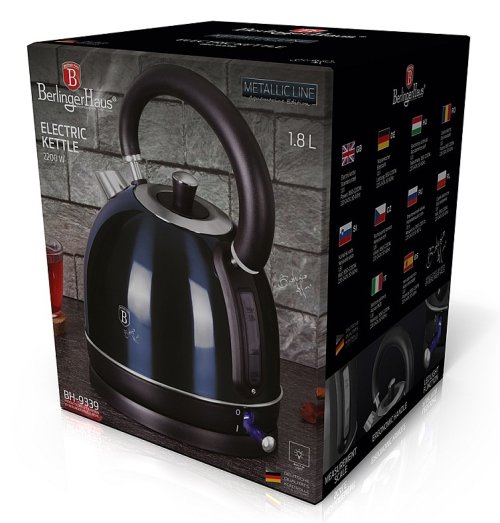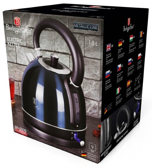 Materiál tohoto produktu je: nerezová ocel - příkon: 2200 w - napětí: 220-240 v - Objem tohoto produktu je: 1,7 l - modré led podsvícení spínacího tlačítka, když je konvice v provozu - nerezové víko - 360° otočný podstavec - automatické vypnutí - odměrná stupnice - nerezové dno - skrytá topná spirála - vestavěný filtr