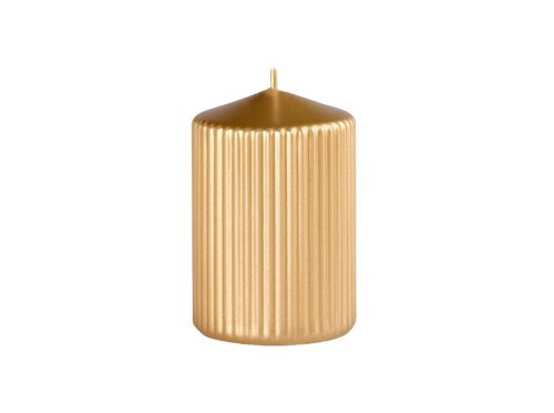 Tato rýhovaná svíčka ve tvaru válce v metalické zlaté barvě je elegantním doplňkem pro každý stůl. Její rozměry jsou 65x100mm.