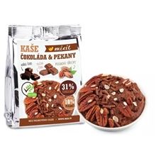 Rýžová kaše Mixit zdobená pecičkami hořké čokolády doplněnými o hoblinky mléčné čokolády, které si skvěle rozumí s křupavými pekanovými ořechy