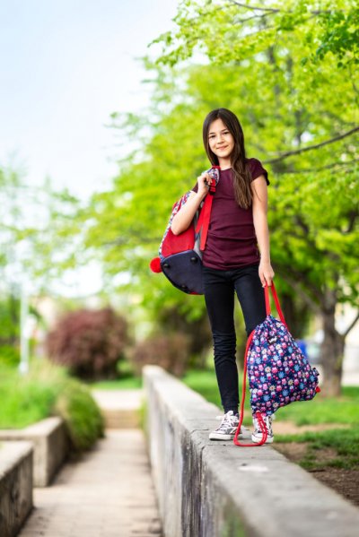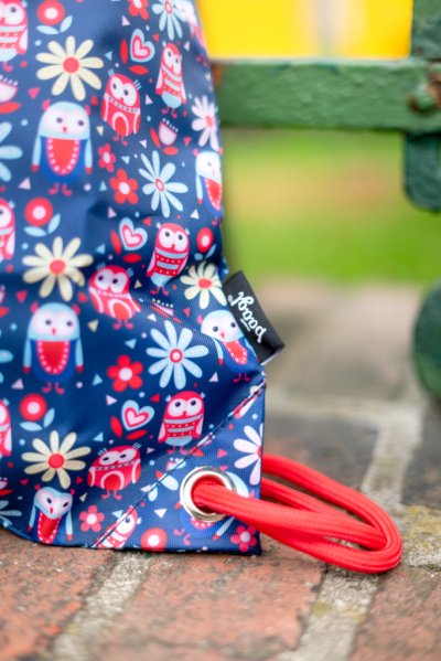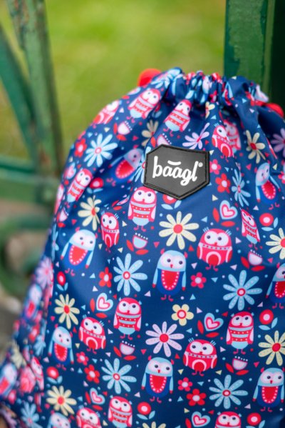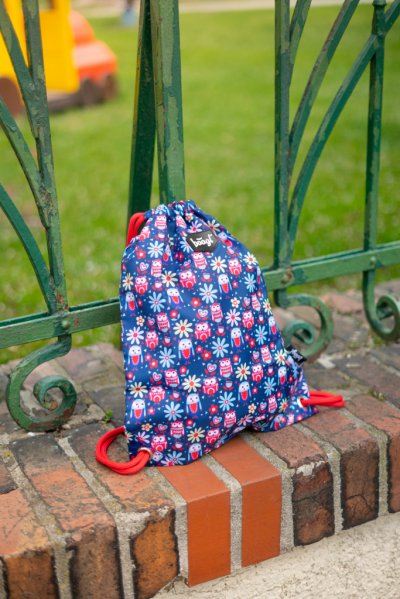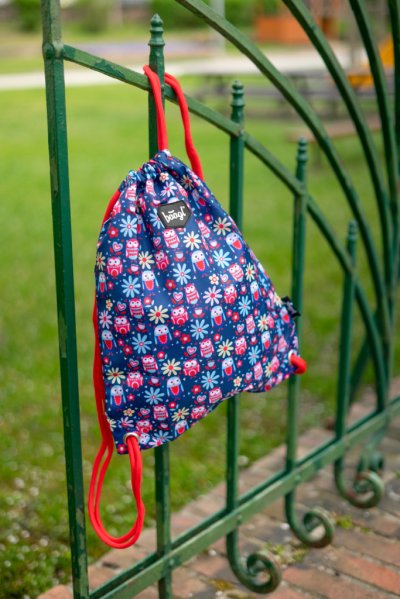 • Sáček na cvičky nebo přezůvky se sovičkami z pevného omyvatelného materiálu • Zdrhování pomocí pevných tkanic, které zároveň umožňují nošení na zádech