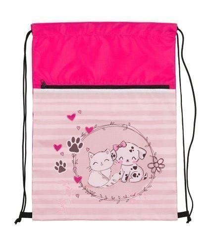 Školní sáček na přezůvky a cvičky vhodný pro žáky 1. stupně ZŠ. Školní sáček je vyroben z pevného a kvalitního materiálu. Rozměr sáčku 440 x 320 mm. Vodoodpudivý pevný materiál udrží věci v suchu. Kapsa na zip oddělí boty od ostatního oblečení. Stahovací šňůrka spojená se spodní částí promění sáček v malý batůžek na záda. Školní sáček je praktickým doplňkem školní aktovky pro uložení cviček či věcí na tělocvik.
