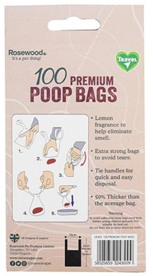 Sáčky jsou nepostradatelným pomocníkem při úklidu psích exkrementů. Rosewood Premium Poop Bags jsou navíc větší a mimořádně pevné (až o 50 % tlustší) než běžné sáčky na psí výkaly. Sáček lze po použití zavázat a má citronové aroma. Složení: recyklovaný plast Rozměry (cca): šířka 26 cm, výška (s uchy) 34 cm Barva: černá