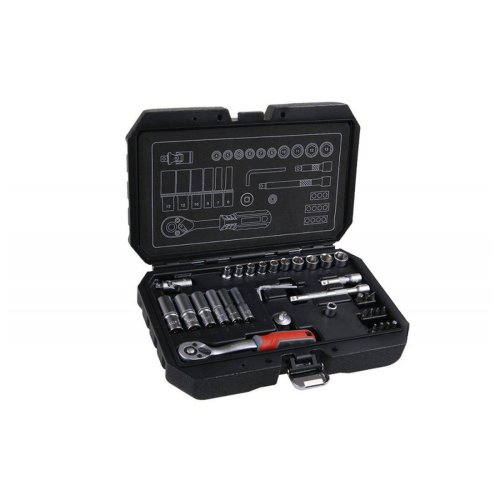 materiály: z vysoce kvalitní chrom-vanadiové oceli, niklová povrchová úprava, hroty bitů ze slitiny oceli S2, ráčny mají jemné dělení 72 zubů, tělo ráčny z CrV oceli, zubový mechanismus z S2 oceli, ergonomicky tvarovanou rukojeť se zdravotně nezávadnou gumou Obsahuje sadu 36 dílů. Sada je dodávána v plastovém kufříku - 10 let záruka. Je vhodná jak pro domácí kutily, tak pro profesionály, kteří kladou důraz na kvalitu.