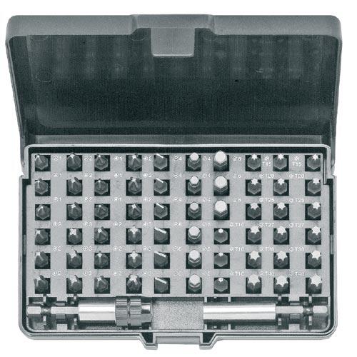 sada obsahuje 62 dílů:: BIT plochý: 3 x 4 mm; 5,5 mm BIT Phillips: 3 x PH1; PH2; PH3 BIT Pozidrive: 3 x PZ1; PZ2; PZ3 BIT Imbus: 3 x 4 mm; 5 mm; 6mm BIT Torx: 3 x T10; T15; T20; T25; T27; T30; T40 1x …