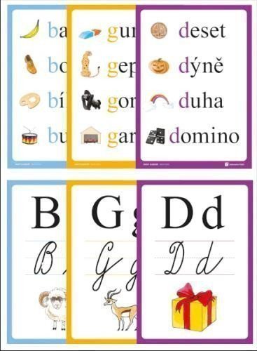 Každá karta prezentuje jedno písmeno.Na přední straně je vyobrazeno písmeno ve všech psaných formách spolu s doprovodným obrázkem, který na písmeno odkazuje.Na zadní straně je několik slov v psaném tvaru, která na písmeno začínají, spolu s odpovídajícími obrázky.Jedná se oběžná slova, která má žák zažita, takže si k nim snadno přiřadí písmena.Karty formátu A4, které lze vyvěsit ve třídě.