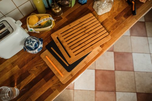 Tří dílná sada na krájení: prkénko na krájení chleba a jiného pečiva s drážkami, ploché prkénko na krájení s vyměnitelnou plastovou deskou. Prkénka mají silikonové protiskluzové nožička a patku pro snadné uložení. Jsou vyrobena z bambusu, povrch je ošetřen lněným olejem. Délka: 35 cm, šířka: 25 cm. Hmotnost: 2,015 kg. Původní FIS číslo 1014212.