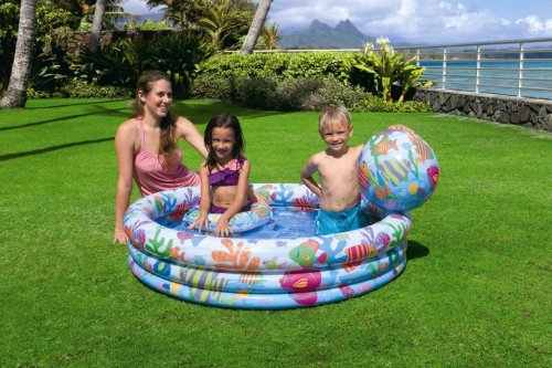 Bazénový set Ovoce obsahuje míč, plovací kruh (51 cm) a bazén (132×28cm). Opravná záplata je přiložena v balení.