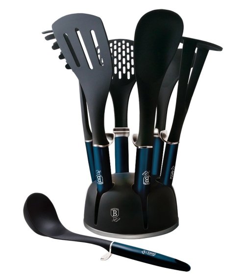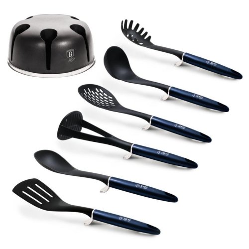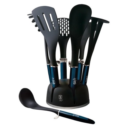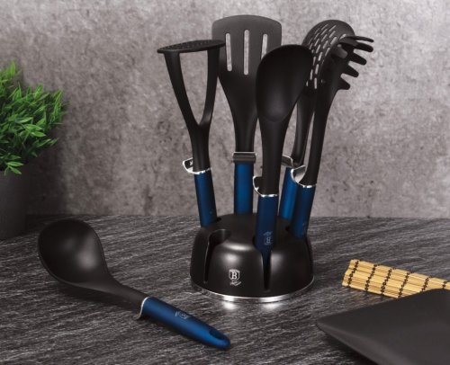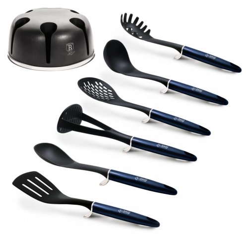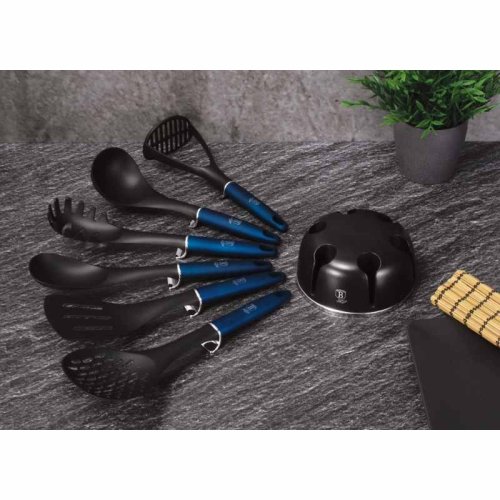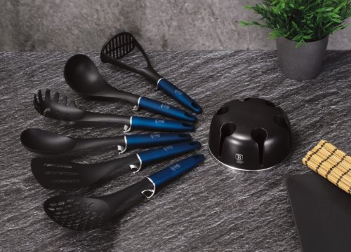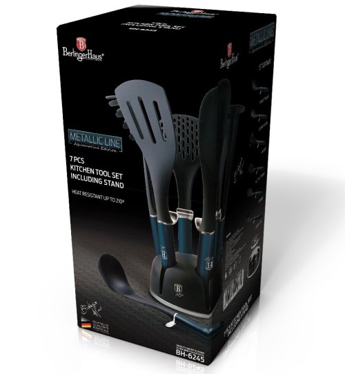 Designová sada kuchyňského náčiní BerlingerHaus z kolekce Aquamarine Metallic Line přináší funkčnost i styl do každé moderní kuchyně. Je vyrobené z odolného nylonu šetrného k nepřilnavým a keramickým povrchům, který nepoškrábe nádobí a je odolný vůči teplotám až do 220 °C. Každý kus má praktickou nožičku, díky které náčiní zůstává po položení ve vzduchu a nezašpiní pracovní desku.