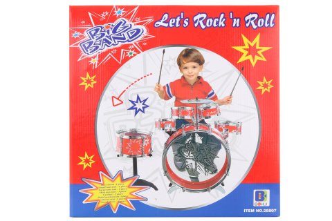 Sada na bicí. Obsahuje 1 basový buben, 1 malý tom tom, 1 velký tom tom, 3 mini tom tomy, 1 činel, 1 pedálový mechanismus, 2 paličky a 1 židli. Rozměry balení 39,5 x 17 x 40 cm. Od 3 let.