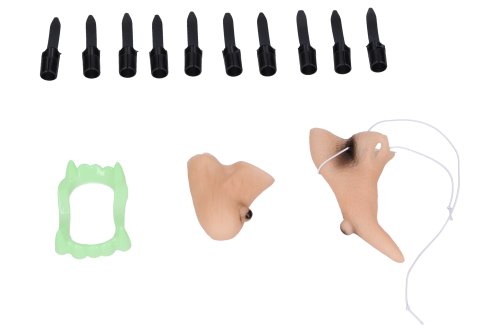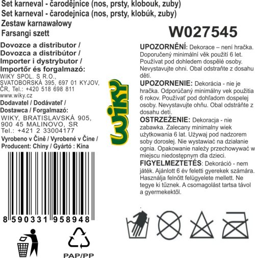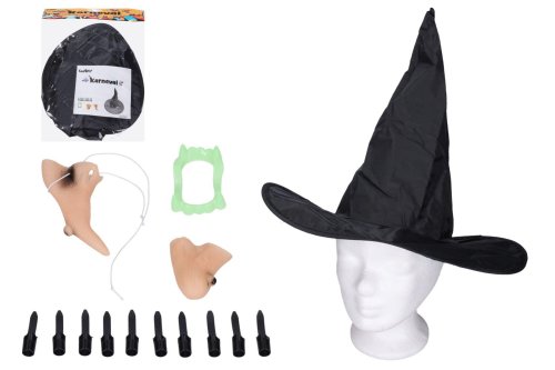 Set pro každou správnou čarodějnici Set obsahuje: bradu na gumičce, nos na gumičce, 10 nasazovacích prstů s nehty, zuby a velký čarodějnický klobouk