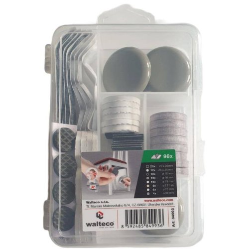 • Filcové podložky: 20x20 mm černá - 20x, Ø 15 mm šedá - 16 ks, Ø 15 mm bílá - 16 ks, Ø 25 mm béžová - 8 ks
