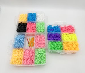 Sada gumiček Loom Band obsahuje celkem 3 000 kusů barevných pružných gumiček, které jsou rozděleny do tří průhledných plastových boxů s přehlednými přepážkami. Každý box je členěn na několik oddílů, což usnadňuje organizaci a výběr jednotlivých barev. Gumičky jsou v různých odstínech – najdete zde jasné neonové barvy jako žlutou, růžovou, oranžovou či zelenou, ale také jemnější pastelové tóny, dvoubarevné varianty a klasickou černou či bílou. Tento široký barevný výběr umožňuje vytvářet náramky a další ozdoby v různých barevných kombinacích a vzorech.