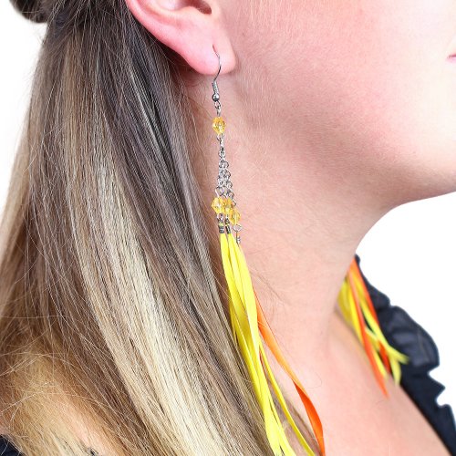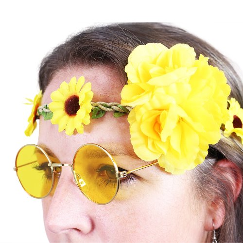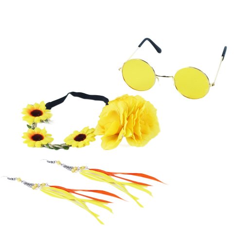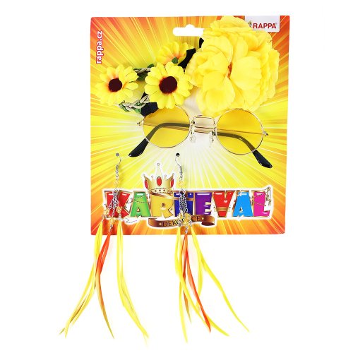 Parádní sada hippies, ve které najdeš čelenku se žlutými kvítky, dlouhé žluto-oranžové náušnice a brýle lenonky. Perfektní doplňky na karneval či párty.
