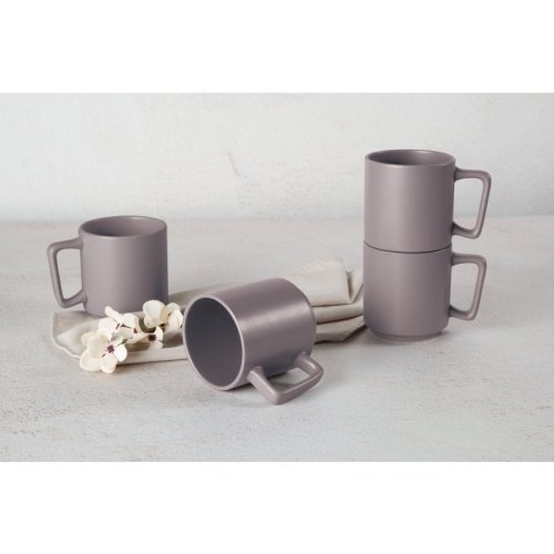 Materiál: kamenina - 4 ks 300 ml hrnek 9,5*9 cm - Barva: matná šedohnědá taupe - kamenina prémiové kvality - Možnost stohování - Matný design - Lze mýt v myčce nádobí - Vhodné do mikrovlnné trouby