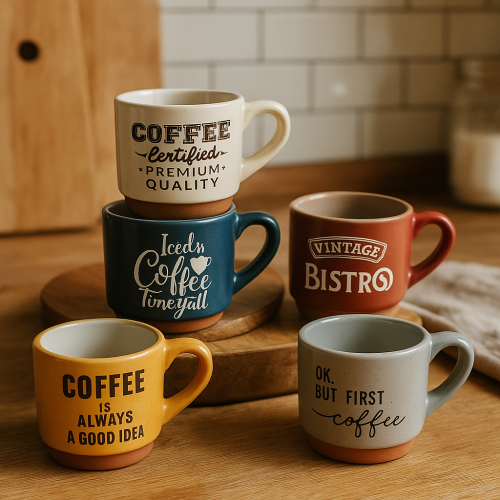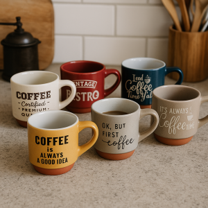 Sada 6 kameninových hrnků s různými kávovými motivy.