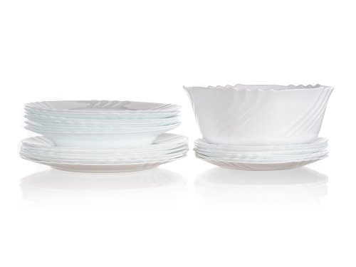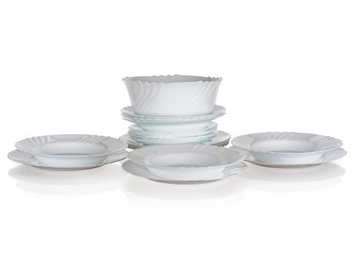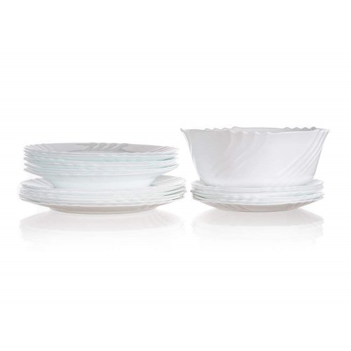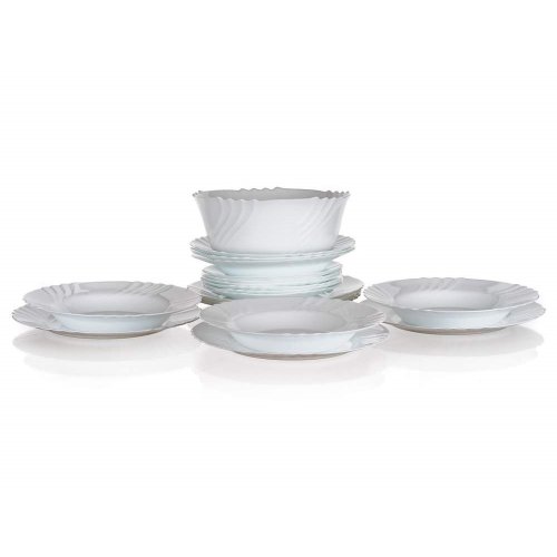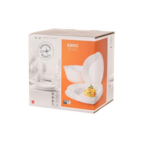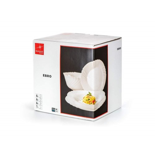 19dílná skleněná sada EBRO obsahuje: 6 x dezertní talíř o průměru 20 cm 6 x mělký talíř o průměru 25,5 cm 6 x hluboký talíř o průměru 23,5 cm 1 x mísa o průměru 23 cm
