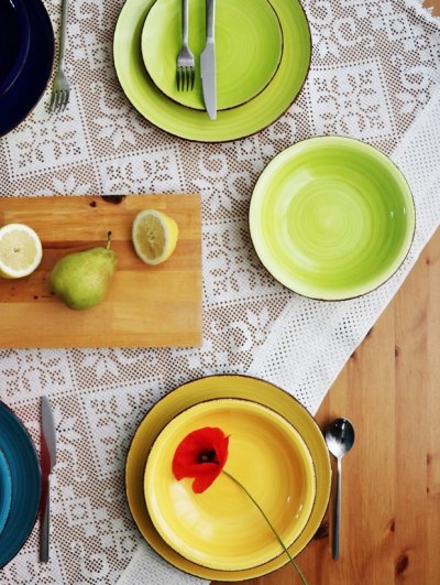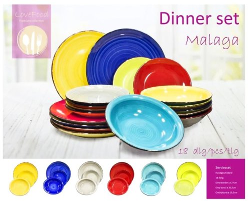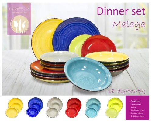 Vneste léto do svého domova s touto 18dílnou sadou nádobí model ´Malaga´. Tato sada je vhodná pro 6 osob. Sada se skládá z: 6x jídelní talíř 27 cm 6x hluboký talíř 20,5 cm 6x snídaňový talíř 19,5 cm. Nádobí je vhodné do myčky.