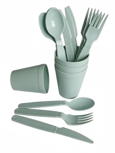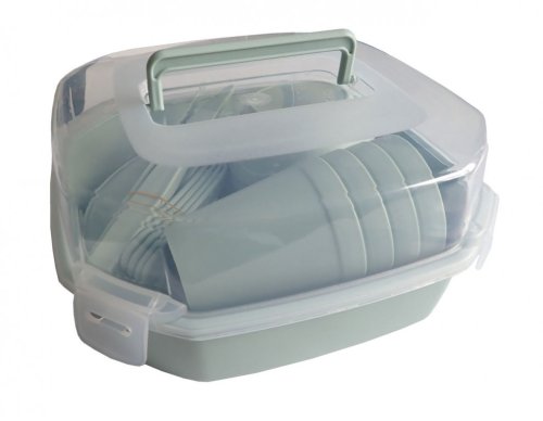 Kempingová sada plastového nádobí se skládá z 26 ks součástí. Obsahuje 4 plastové talíře o průměru 23,5 cm, 4 plastové kelímky o objemu 250 ml, 4 plastové misky o objemu 0,35 l, 4 plastové lžíce 18,8 cm, 4 plastové vidličky 18,5 cm, 4 plastové nože 18,7 cm. Vše uzavřeno v praktické dvoudílné dóze s uchem a oddělitelným víkem, která poslouží i jako další nádobí.