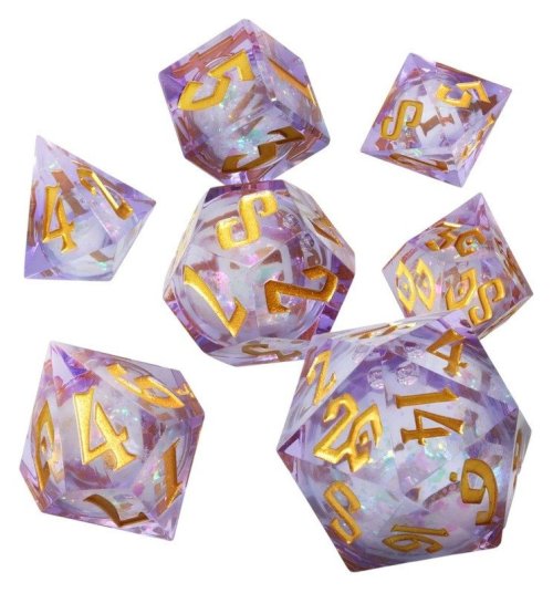 Kostky mají ostré hrany, jsou ručně odlévané z prémiové pryskyřice a uvnitř obsahují tekuté jádro s třpytivými částicemi. Sada obsahuje všechny standardní polyedrické kostky – d4, d6, d8, d10, d12, d20 a procentuální kostku (d10 očíslovanou po desítkách). Každá kostka je pečlivě vyvážená pro férovou hru, čísla jsou hluboce vyražená a ručně malovaná pro snadnou čitelnost. Kostky jsou dodávány v unikátním boxu, který kromě ochrany pomocí kvalitních pěnových vložek slouží také jako kostková věž. Součástí balení jsou také dvě prémiové vinylové samolepky GlassStaff a speciální překvapení, které objevíš po rozbalení sady.
