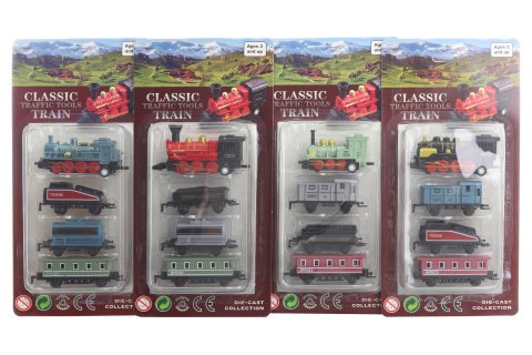 Sada kovových mašinek obsahuje lokomotivu a 3 vagónky. Rozměry lokomotivy cca 7 x 3,5 cm. Rozměry balení cca 11 x 22 x 3 cm. Věk 3+