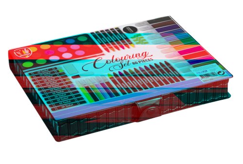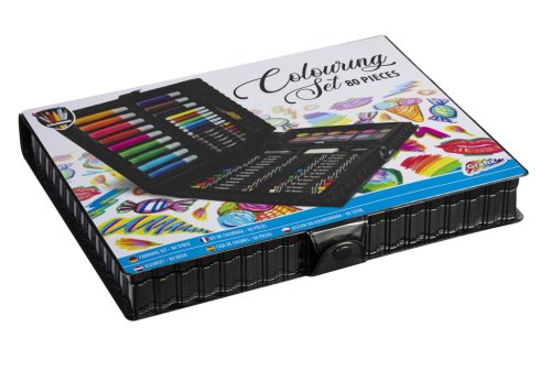 Sada na kreslení obsahuje12 tlustých fixek, 6 tenkých fixek, 18 voskovek, 12 olejových pastelů, vodovky v 18 odstínech, pravítko, ořezávátko, guma a další doplňky. Rozměr balení cca 28 x 22 x 4 cm. Věk 3+