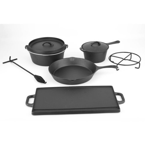 Sada obsahuje vše potřebné pro vaření a grilování na otevřeném ohni.Sada obsahuje:- hrnec s poklicí průměr 26 cm, výška 10 cm- rendlík s poklicí průměr 18 cm, výška 9,5 cm- pánev průměr 30 cm, výška 5 cm.- oboustranná grilovací deska 43 x 23 cm - jedna strana je rovná plocha, druhá žebrovaná- podložka pod nádobí- pomocná tyč k manipulaci s nádobím v ohni- dřevěný úložný box- možnost použítí na všechny varné povrchy včetně indukce- lze mýt v myčce na nádobíNeocenitelné vlastnosti litiny ovlivňují chuť připravovaných pokrmů. Nádobí je také odolné vůči vysokým teplotám. S úspěchem je lze použít na smažení, pečení, ale i do role, tkz. horké talíře. V posledním případě rozehřejeme prázdnou nádobu na sporáku nebo v troubě a do ní pak vložíme hotový pokrm. Nádobí vyrobené z litiny dokonale uchovává teplo a umožňuje tak vaření a pečení při nízkých teplotách. Největší výhodou litiny je však efektivní a rovnoměrné rozložení tepla bez ohledu na to, zda je pánev používána na sporáku nebo v troubě. Po každém použití omyjte teplou vodou se saponátem, osušte a vymažte tukem, abyste zabránili korozi. Před prvním použitím odstraňte antikorozní rostlinný olej z nádoby - umyjte nádobí v horké vodě s vhodným neabrazivním mycím prostředkem a vytřete do sucha. Poté vymažte pánev tukem nebo olejem a důkladně prohřejte. Po vychadnutí otřete přebytečné množství tuku.