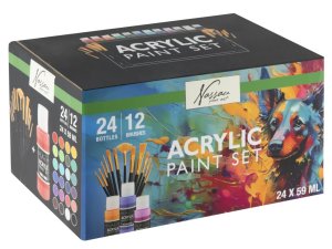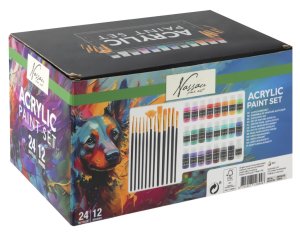 Kompletní malířský set pro začínající i pokročilé umělce. Obsahuje 24 tub akrylových barev v živých odstínech a 12 kvalitních štětců různých velikostí pro přesné i plošné tahy. Barvy mají vysokou krycí schopnost, snadno se míchají a rychle schnou.Ideální pro malování na plátno, papír, dřevo nebo karton.