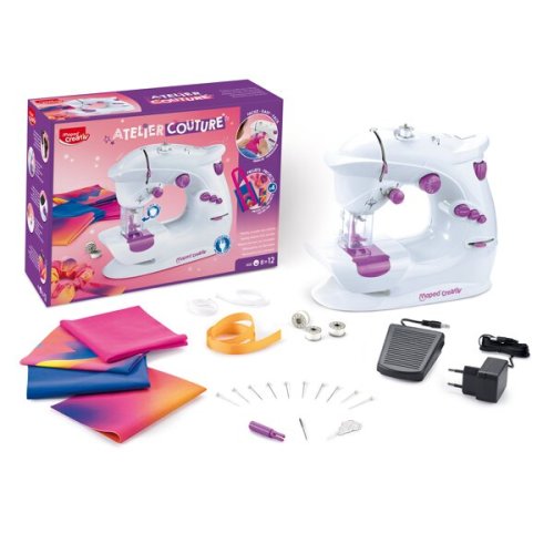 Sada obsahuje:, * předstřižené látky, * šatní gumy, * jehla, * špendlíky, * navlékač, * stuhy, * kovové cívky, * nožní pedál, * nabíječka, * manuál