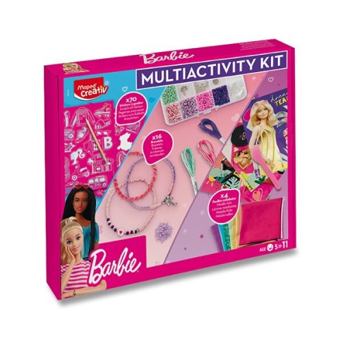 Kreativní sada 3v1 obsahuje tři aktivity v jedné sadě: 4 archy (70 ks) holografických samolepek s motivy panenky Barbie a škrábací dřívko je ideální k personalizaci a zdobení oblíbených předmětů. Korálky, nitě, přívěšky a střapce k vytvoření 16 kusů náramků, včetně plastového úložného boxu. Vyrobte si vlastní originální náramek díky dvěma technikám výroby – tkaní nebo navlékání. 4 karty s motivy panenky Barbie s plochou k aplikaci metalické fólie a vytvoření vlastního obrázku, včetně 12 metalických fólií a hladítka k aplikaci fólie. Vhodné pro děti od 5 let.