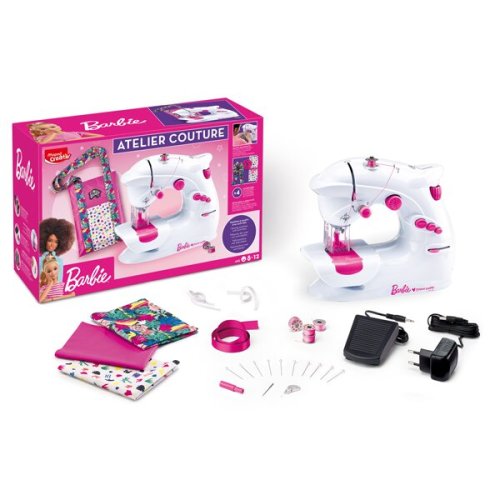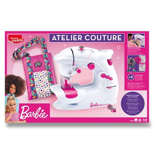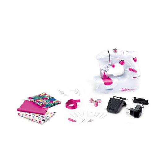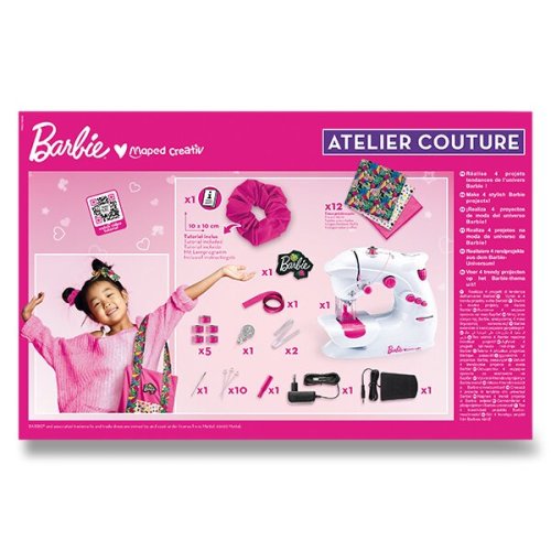 Sada obsahuje:, * funkční šicí stroj Barbie (včetně adaptéru a nabíječky), * šicí potřeby včetně jehel a nití, * návod na ušití 4 různých produktů, * 12 vzorníků látek v různých velikostech, * nášivku Barbie