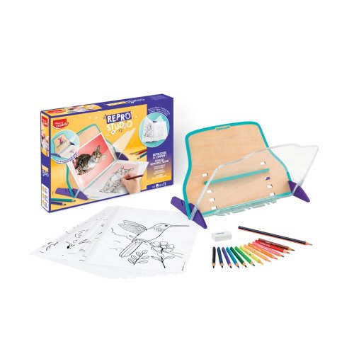 Sada obsahuje:, * magické zrcadlo Repro'Studio, * 12 mini pastelek Maped Strong, * 10 šablon s kresbami, * grafitovou tužku, * pryž