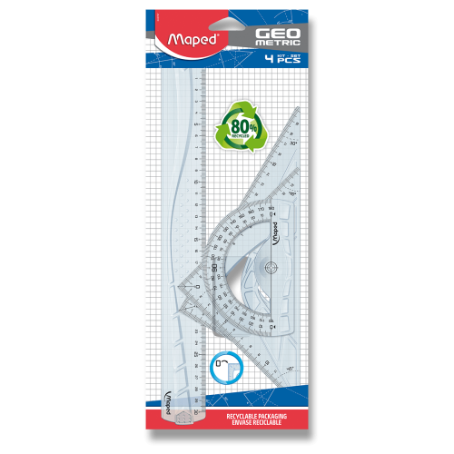 4dílná sada Maped Geometric Maxi rýsovacích potřeb s vysoce kvalitním značením. Stupnice jsou natištěny za použití UV inkoustu a jsou maximálně odolné. Sada obsahuje: