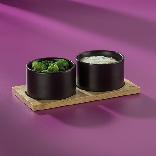 2 malé kulaté misky Porcelánová matná černá na dřevěném talíři Miska: 10 cm v 6,5 cm Dřevěný talíř: 23,5 x 12 cm v. 1,5 cm