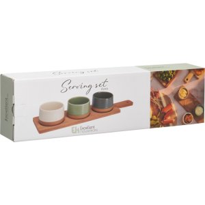 Přineste do svého stolování styl i harmonii. Tato servírovací sada obsahuje tři kameninové misky v zemitých barvách usazené na tmavém bambusovém prkénku. Skvělá volba pro servírování předkrmů, dipů, oříšků nebo malých pochutin při každé příležitosti.