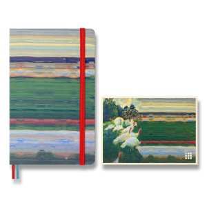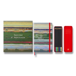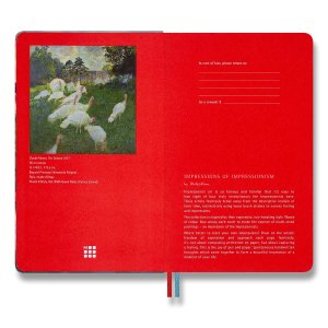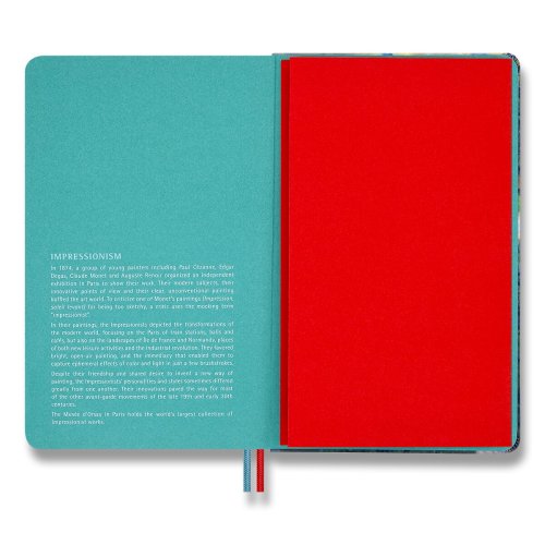 ZÁPISNÍK MOLESKINE IMPRESSIONISM - TVRDÉ DESKY, Zápisník s pevnou, ve hřbetu šitou vazbou v kartonových deskách potažených látkou obepnuté pružnou páskou proti samovolnému otevírání. Zápisník vybaven kapsou na vizitky a drobnosti,, která je vyrobena z tkaniny a kartonu, dvojitou textilní záložkou, tematickou pohlednicí a letákem s historií MOLESKINE., Gramáž papíru 100 g/m², neobsahuje kyseliny. Papír v slonovinové barvě, vyroben z FSC certifikovaného dřeva., ROZMĚR: 13 x 21 cm, 88 listů, linkovaný, , Dodáváno v kartonovém dárkovém boxu.