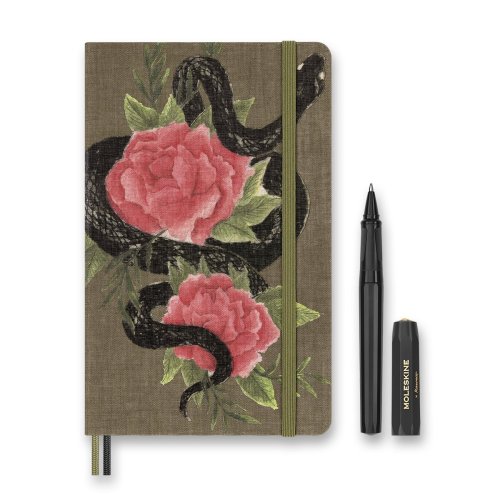Sběratelská edice zápisníku Moleskine Snake Roses velikosti L z kolekce Year of the Snake., Pevná, ve hřbetu šitá vazba v kartonových deskách potažený látkou s motivy hada, který harmonicky splývá s odkvětními lístky dvou květů v jeho přirozeném prostředí tropické, zeleně. Textilní materiál desek připomíná surové plátno a vzdává hold umělecké a tvůrčí podstatě hada. Desky jsou obepnuté pružnou páskou proti samovolnému otevírání. Zápisník, vybaven kapsou na vizitky a drobnosti, která je vyrobena z tkaniny a kartonu, dvojitou textilní záložkou, 2 listy tematických samolepek, 2 tematickými obálkami a letákem s historií MOLESKINE., Gramáž papíru 100 g/m², neobsahuje kyseliny., Rozměry 13 x 21 cm, 88 listů, linkovaný. Zápisník je v anglickém jazyce.