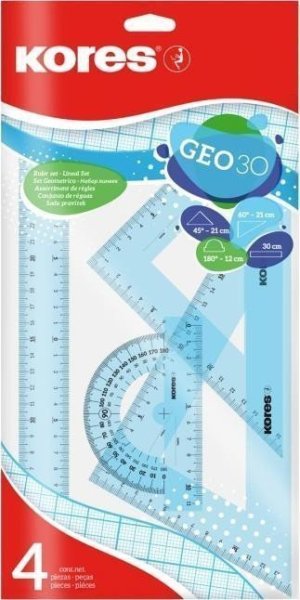 Sada geometrii - 4 kusy • vyrobeno z plastu • s okrajem inkoustu pro čisté linie • s polem názvu pro označení • Tisk v čistém měřítku v černé barvě • v závěsném obalu • Různé v barvách: světle modrá a světle růžová -> není možný žádný speciální požadavek na barvu Obsah: 1x pravítko 300 mm 1x trojúhelník 45 ° 210 mm 1x trojúhelník 60 ° 210 mm 1x úhloměr 180 ° / 120 m