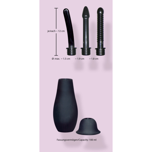 Sada na intimní hygienu se 3 různými nástavci. Můžete jej použít análně i vaginálně dle vašich potřeb. Klystýr se skládá z nafukovacího balónku o objemu 150 ml. Ten stačí napustit vodou a přidat jeden ze tří nástavců. Jeden je hladký a zahnutý, druhý má úzkou špičku a třetí má vroubky na povrchu. Každý z nich vás bude jinak dráždit. Klystýr je vyroben z kvalitního ABS materiálu v černém lesklém provedení.