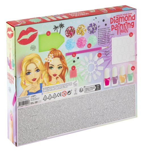 Sada na lakování nehtů Diamond Besties – obsahuje aplikátor diamantů, 6 ruzných barev diamantů, 4 laky na nehty, houbičku, umělé nehty a třídič na kamínky.
