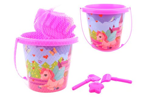 Sada na písek obsahuje kyblík, hrabičky, lopatku a formičku ve tvaru hvězdičky. Baleno v síťce. Rozměry kyblíku cca 13x15 cm. Věk 3+