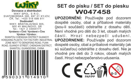 Sada na písek kyblík s nářadím a formičkami. Rozměry kyblíku 9,5x9x16 cm. Obsah balení - kyblík, 2x lopatka, sítko, hrabičky, 3x formičky. 4 varianty - modrá, zelená, žlutá, červená.