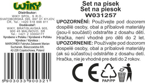 Sada na písek malá kyblík 10x11 cm. Obsah balení - kyblík 10x11cm, hrábě, lopatka, 3xformičky (rybka, bábovka, kačenka). 4 varianty - modrá, červená, žlutá, zelená.