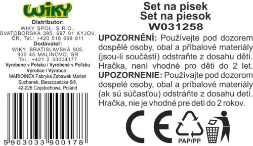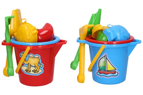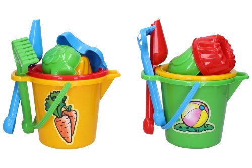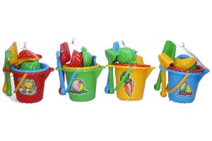 Sada na písek malá kyblík s výlevkou 16x11 cm. Obsah balení - kyblík 16x11cm, sítko, hrábě, lopatka, 3xformičky (bábovka, rybka, kačenka). 4 varianty - červená, modrá, zelená, žlutá.