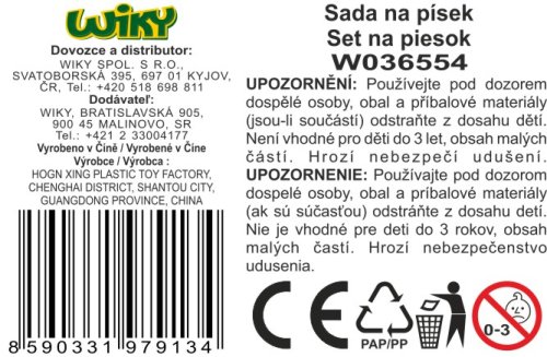 Sada na písek. Rozměry 18x15x20 cm. Součástí kyblík, konvička, lopatka, hrábě, 3 formičky.