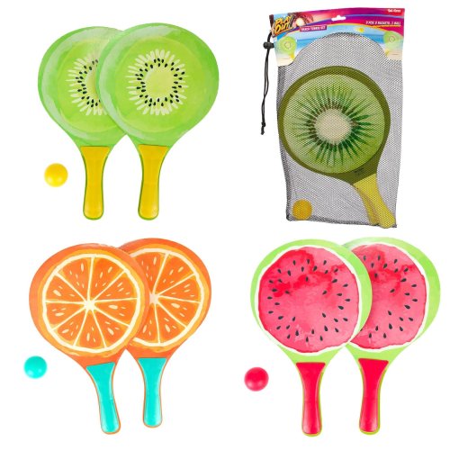 Letní klasika v barevném ovocném stylu! Tato sada na plážový tenis je skvělou volbou pro aktivní zábavu u moře, na zahradě i na hřišti. Veselé designy a pevné dřevěné pálky zaručí hodiny zábavy pro děti i dospělé. Vhodné pro děti od 3 let