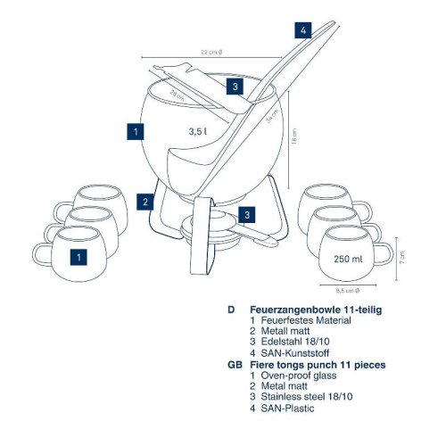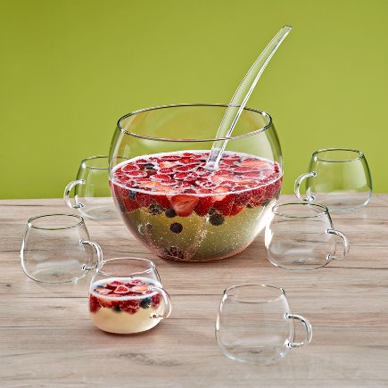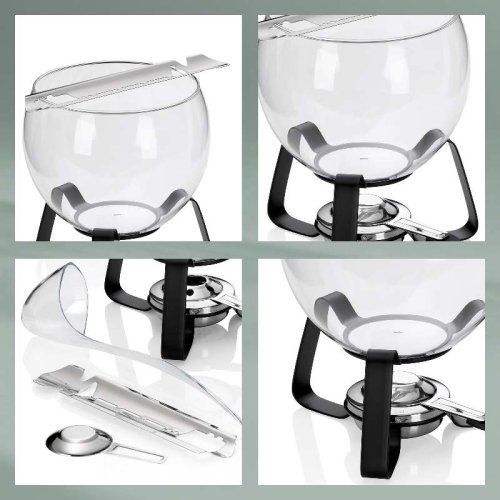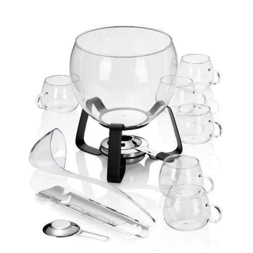Pro stylové večery s přáteli.Sada obsahuje:- žaruvzdornou skleněnou punčovou mísu,- objem 3,5 l,- 6 sklenic, - akrylovou naběračku,- nerezové kleště na cukr,- kovový stojan průměr 13,5 cm,- bezpečnostní hořák na pastu z nerezové oceli.Upozornění: Nelijte rum přímo na hořák.
