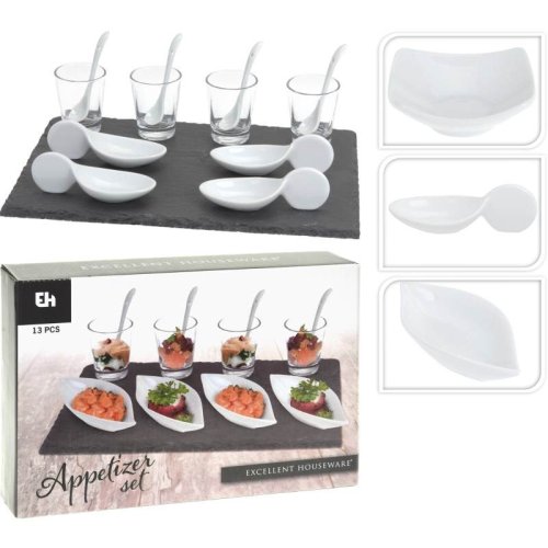 servírovací set misek (kanapek) a skleniček se lžičkou na tácu pro nejrůznější příležitosti- materiál: porcelán / sklo / břidlice- barva: bílá / transparentní / šedá- perfektní pro servírování předkrmů, pochutin, dipů a omáček- vhodné do myčky nádobí- sada obsahuje břidlicový podnos s protiskluzovými nožkami, 4 porcelánové misky (kanapky), 4 skleničky a 4 porcelánové lžičky- rozměry podnosu: 295 x 200 x 5mm- rozměr skleniček: pr. 42 x 60 mm- průměr dna skleniček: 42 mm- rozměr lžiček: 92 x 20 mm- tvar misky (kanapky): lžička- značka: Excellent Houseware