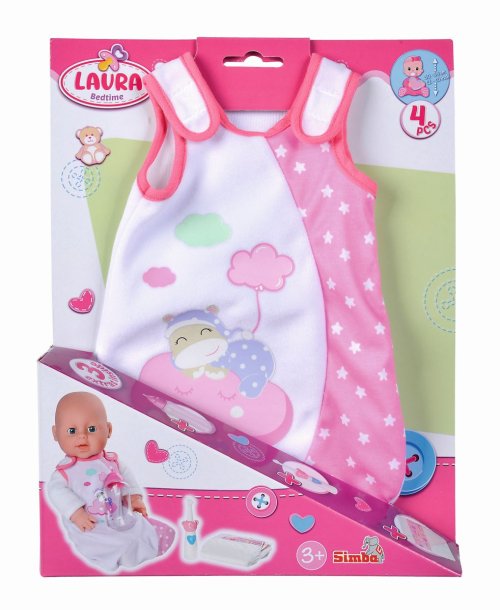 Sada na spaní obsahuje spací pytel, zubní kartáček, plenku a lahvičku pro panenky o velikosti 30-38 cm.